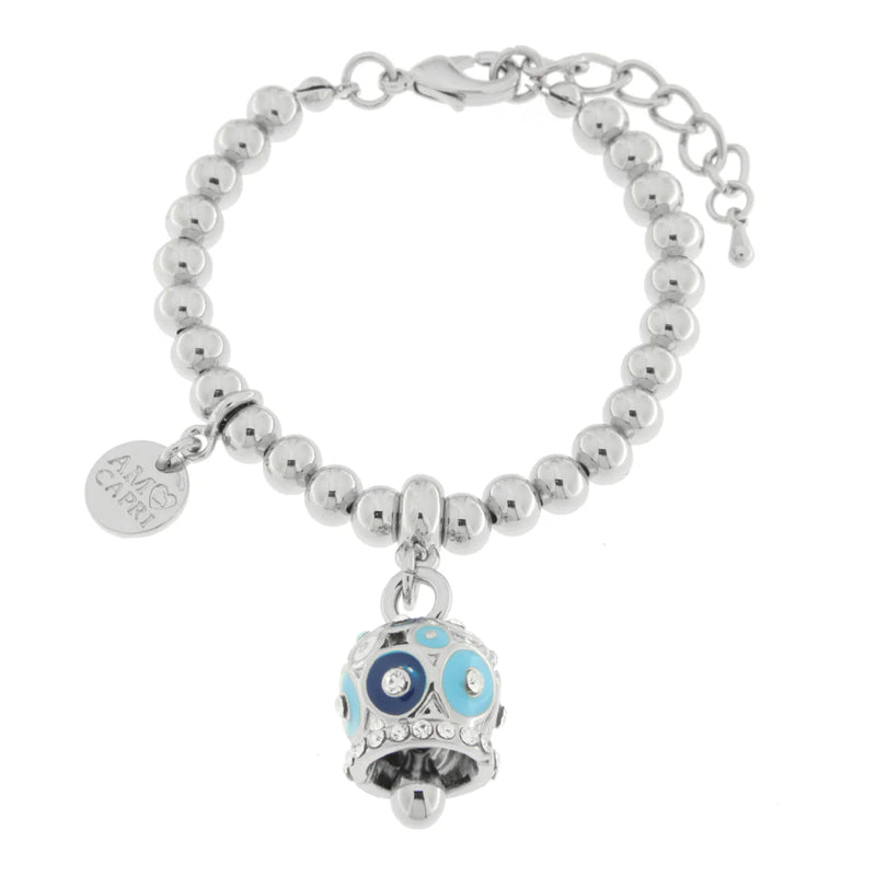 AMO CAPRI - Bracciale in Metallo con campanella a pois blu e azzurro e zirconi