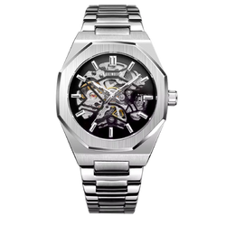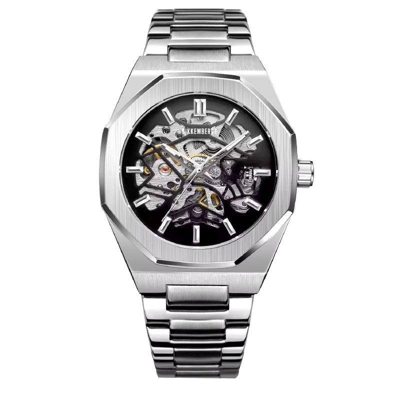 meccanica. La cassa in acciaio misura 40mm di diametro e 47mm di lunghezza, con uno spessore di 11.8mm, offrendo una presenza solida e raffinata al polso. Il cinturino in acciaio solido completa l'estetica sofisticata, mentre la cromia argento uniforme di cassa, ghiera e cinturino conferisce un aspetto armonioso. Il movimento BKK 01 Skeleton automatico è visibile attraverso il quadrante scheletrato e il fondello a vista, permettendo di ammirare la precisione dell'orologio. Con una resistenza all'acqua fino a 5 ATM, questo segnatempo unisce funzionalità e stile, ideale per l'uso quotidiano e le occasioni speciali.