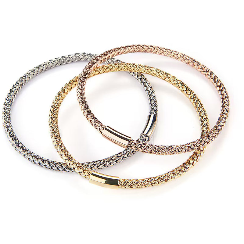 Set di bracciali da donna della collezione fashion mood di Sovrani. Tris di bracciali rigidi in ottone con finitura dorata, colore oro rose' e rodio. La chiusura è a scomparsa. La referenza è j6614