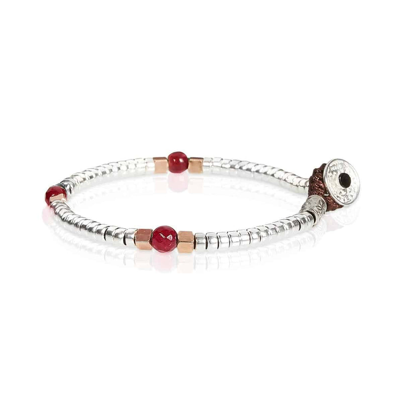 Braccialetto realizzato con passanti in argento 925% con finitura silver e rose gold; sfere in agata rossa dal diametro di 6 mm.