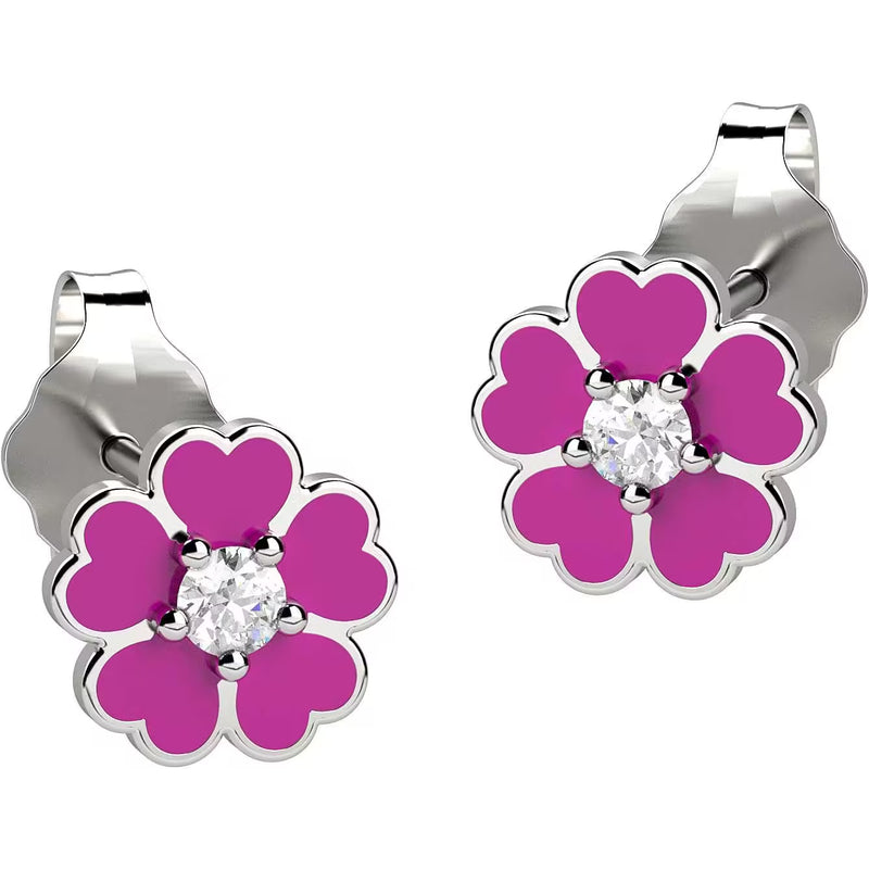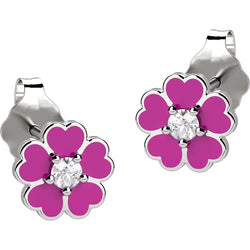 Orecchini da donna e bimba realizzati in argento 925% con fiore rosa impreziosito da cristallo bianco centrale.