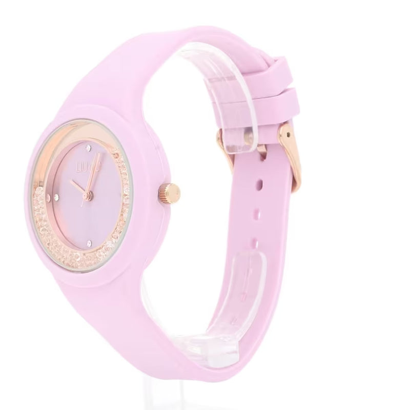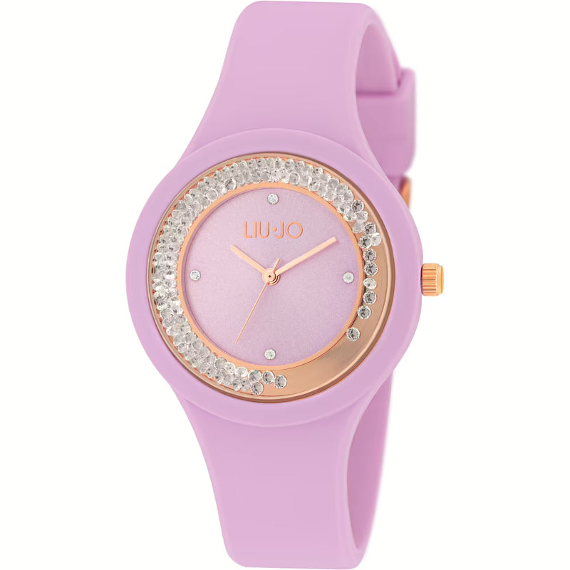 Orologio solo tempo da donna della collezione dancing sport. Orologio con cassa in acciaio inossidabile di colore rose gold e del diametro di 38 mm. Vetro minerale e quadrante di colore pink con cristalli sciolti nella lunetta. Cinturino in silicone di colore pink. Resistenza all'acqua di 3 atm e movimento quartz seiko pc21. La referenza è tlj1421Caratteristiche solo tempo TLJ1421 Liujo