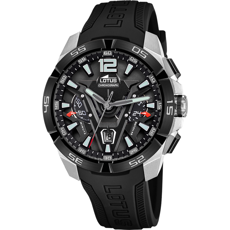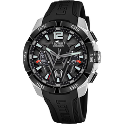 Orologio cronografo da uomo di Lotus della collezione Vortex. Orologio in acciaio inossidabile 316l, con vetro minerale, sfera di colore nero, indice di colore grigio. Cinturino in gomma, dimensione cinturino: 23 con chiusura HEB. Cassa rotonda, dimensione: 45.3, spessore: 15,05. Resistenza all'acqua: 10 ATM. La referenza è 18944/2Caratteristiche cronografo 18944/2 Lotus
