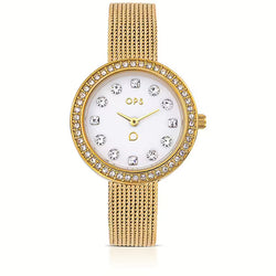 Orologio di Ops della collezione Fine. La cassa misura 30 mm ed é di colore oro. Il quadrante è bianco. Il cinturino è mesh oro. La refernza è: OPSPW-971Caratteristiche solo tempo OPSPW-971 Ops Objects