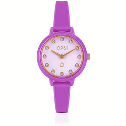 Orologio da donna della collezione Precious Round di Ops. Orologio con cassa di 30 mm in plastica viola. Il quadrante è viola lucido con pietre bianche e cinturino in silicone viola. La referenza è OPSPW-1021
